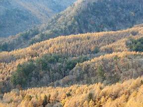 でもカラ松の黄色の紅葉が鮮やかになった。斜光線で見ると黄金色に輝くすばらしい