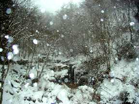 昨日の雪が平地でも50〜60cm積もった。ここ数年ない大雪で家の周りの雪カキが大変だっった。 国道299号線は除雪はされているが圧雪状態で道路の脇には1m以上の雪の壁ができている。 道路以外に入るにはカンジキなどが必要だ。木々に付いた雪が強い風に飛ばされていた。 |