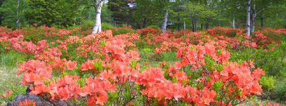 この週末で花木園(有料大人200円)のレンゲツツジがご覧の通り満開となりました。 今年は例年になく花付きがよく素晴らしい光景です。是非ご自分の目で実際に 見て下さい。この花木園の上部の白樺林の遊歩道脇にはかわいいベニバナイチヤクソウ が一面咲いています。踏みつけないように近くでのぞいて下さい。とてもきれいです。 |