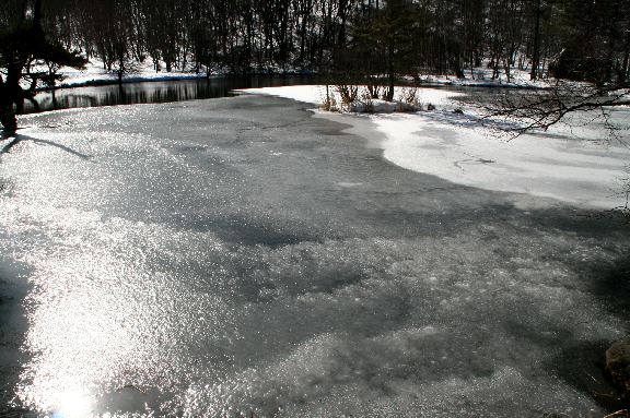 | 駒出池の氷も半分以上溶けかかっている |