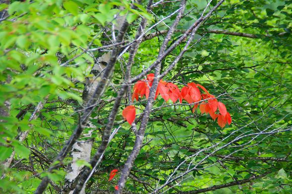| 山桜の葉はすでに赤い葉も混ざり始めた |