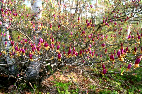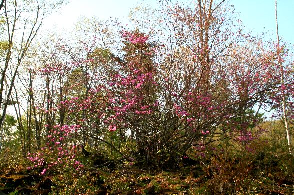 | こちらはレイク下の丘の上ミツバツツジ(高原の貴公子)、下方が少し咲き出しています。 |