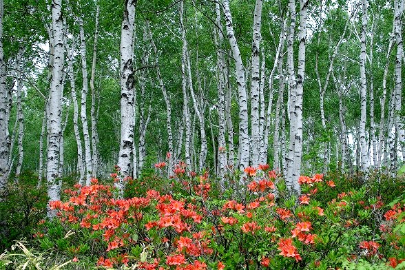 | レイク北線の様子、白樺とレンゲツツジの組み合わせ、今日明日は霧も期待できそう |