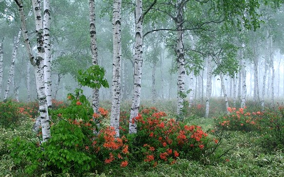| ツツジが無くても霧中の白樺林は綺麗だ |