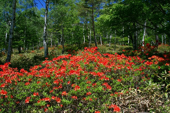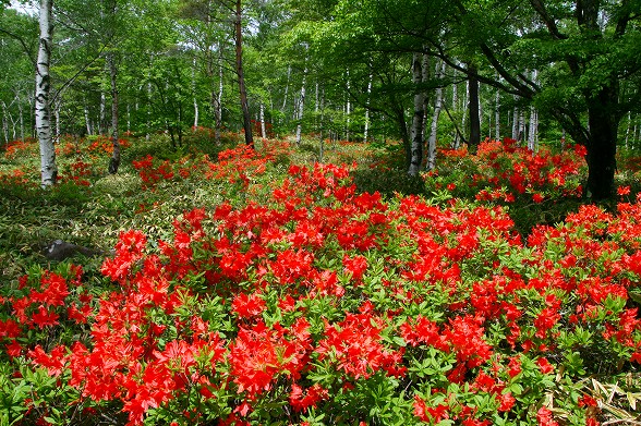 高原のツツジもいよいよ最後のレンゲツツジがほぼ見頃になりました。駒出池周辺もまだ 綺麗です。レイク北線の白樺林でも樹によっては満開や8-9分咲です。 白樺林に咲く真っ赤なレンゲツツジをご堪能ください。 花木園ではスズラン、アマドコロベニバナイチヤクソウ クリンソウなどが見頃です。もちろんレンゲツツジも満開。 |