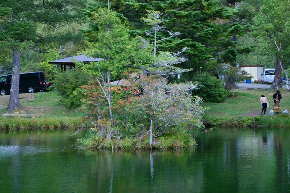 | 紅葉が始まってきた駒出池を楽しむキャンパー |