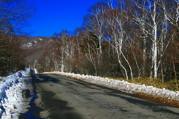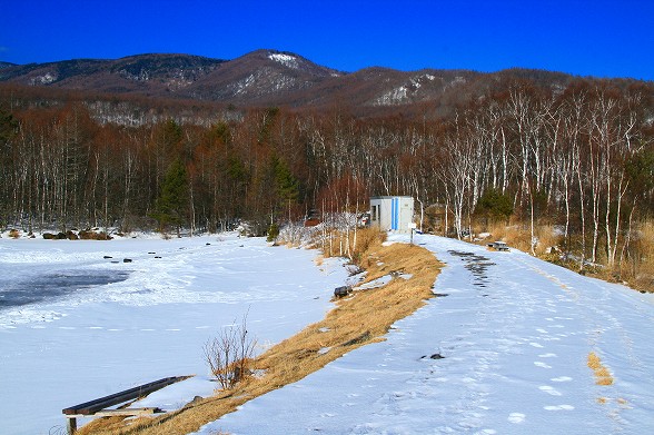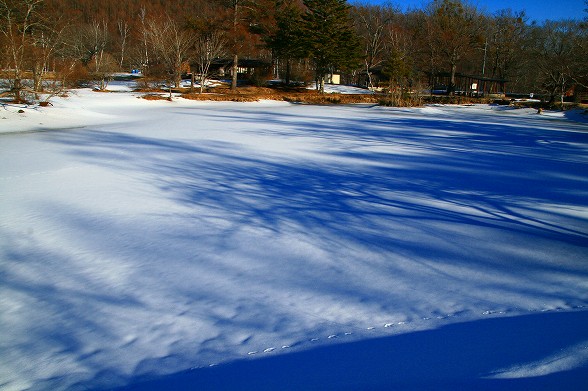 高原の道路わきの雪も大分増えましたが日中の日差しは強くなってきました。 ただ、積雪もまだ油断できません。樹影や雪景色が綺麗です。駒出池は 全面雪におおわれていますが水量が減っています。 |